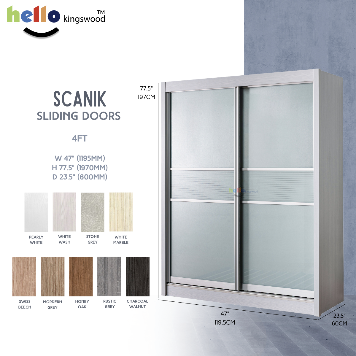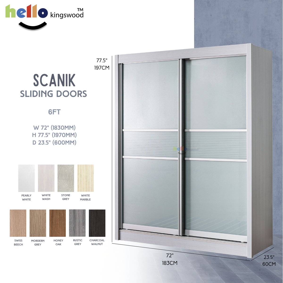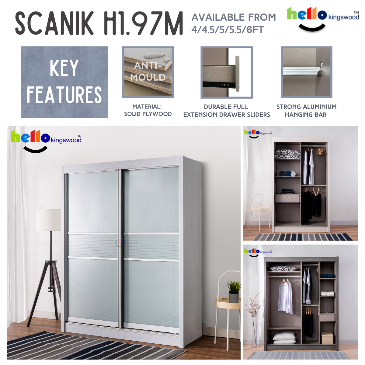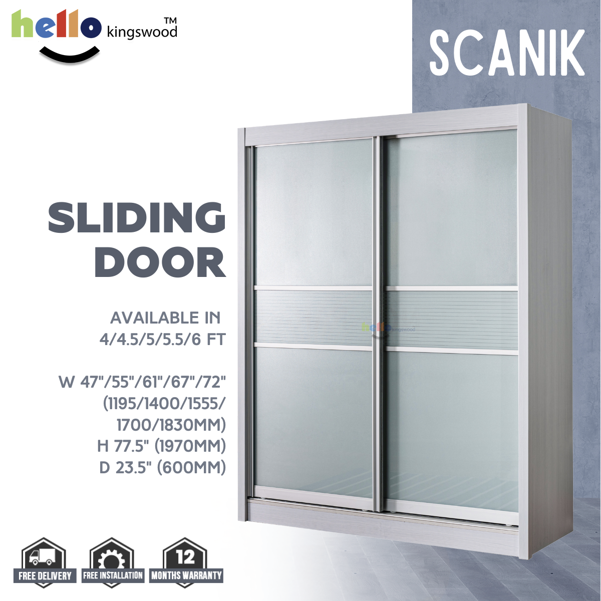 12 months manufacturer warranty included Material: Solid Plywood Sturdy aluminium door frame Strong aluminium hanging bar Durable full extension drawer slides Width: 4, 4.5, 5, 5.5, 6ft Dimensions: H77.5" X D23.5" Frame Colour: Available in 9 trendy colours Scanik Door Design: Metallic Silver (Glass) + Metallic Silver Lines (Glass) Please PM us if you are looking for height 2.4m sliding wardrobes.