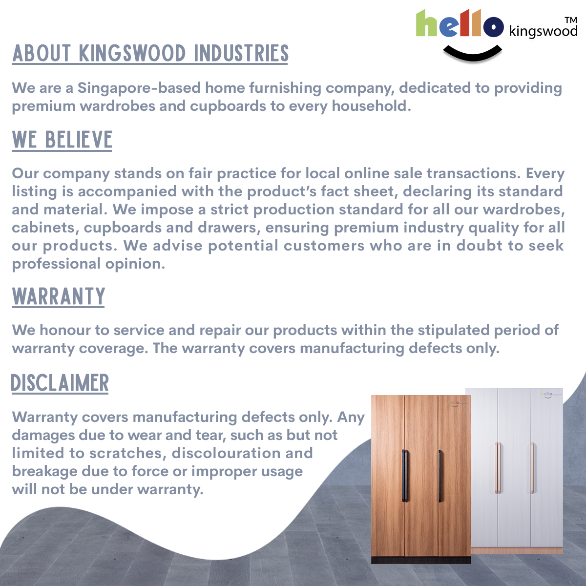 12 months manufacturer warranty included Material: Solid Plywood Sturdy aluminium door frame Strong aluminium hanging bar Durable full extension drawer slides Width: 4, 4.5, 5, 5.5, 6ft Dimensions: H77.5" X D23.5" Frame Colour: Available in 9 trendy colours Mirage 4 Door Design: Full Mirror + Metallic White (Glass) Please PM us if you are looking for height 2.4m sliding wardrobes.