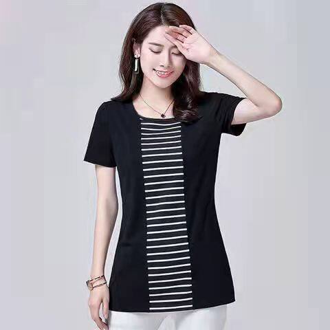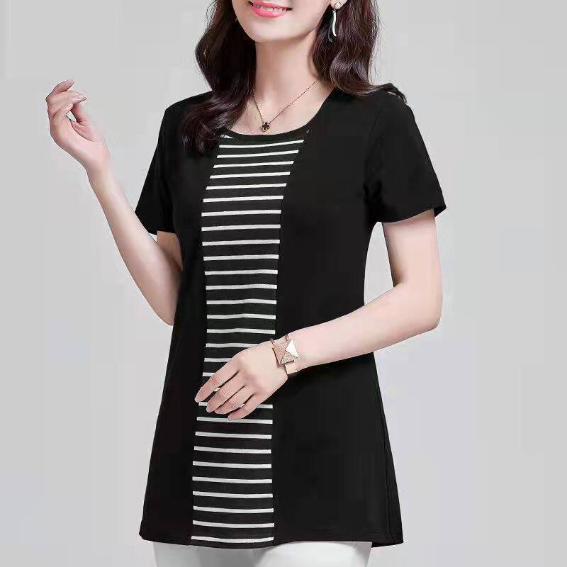 100KG Fat Female Can Wear 2022 New Korean Stripe Long T shirt Women Short Sleeve Plus Size Cover belly round neck fashion t-shirt dress elegant blouse women Tees