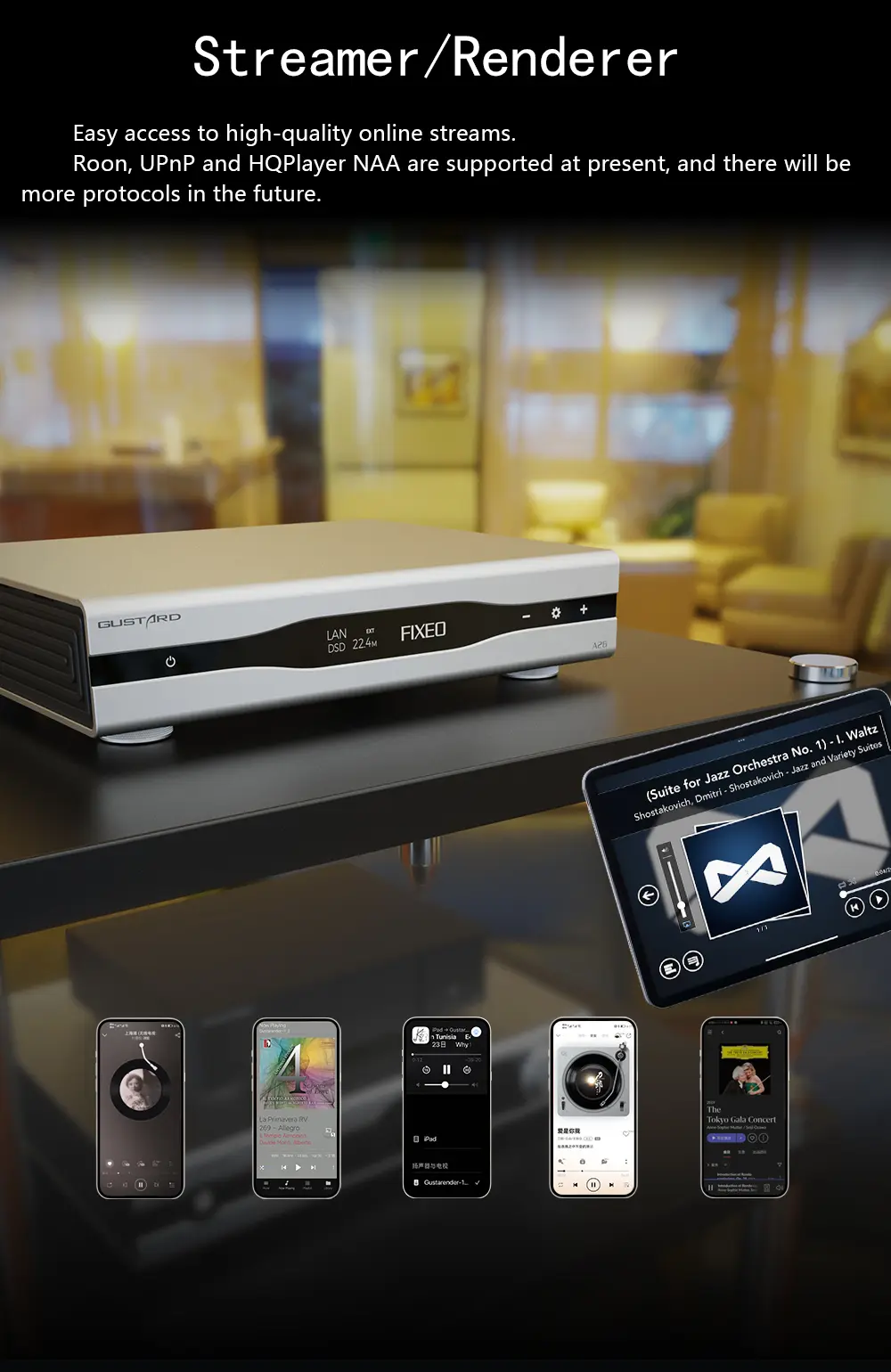 > Adopting FPGA exclusive technology, the A26 features signal routing, clock management, 2rd order PLL, DOP decoding, and Depop for PCM & DSD. Besides, utilizing Streamer/Renderer, an easy access to high-quality online streams, the GUSTARD A26 can supports Roon /UPnP /HQ Player NAA at present, and there will be more protocols in the future.