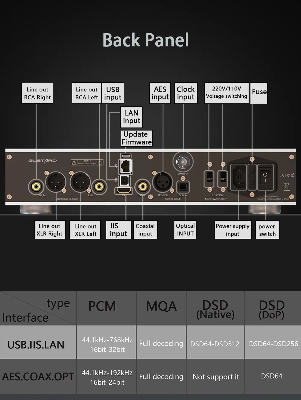 > IIS/USB/LAN: DSD64~DSD512, PCM 44.1K-768K, MQA 8X